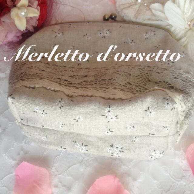 リネン小花柄とレースのがま口ポーチ(ベージュ)