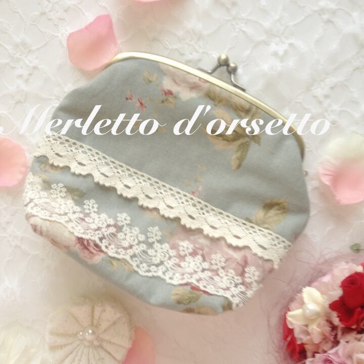 オールドローズとレースのがま口ポーチ(サックスブルー)