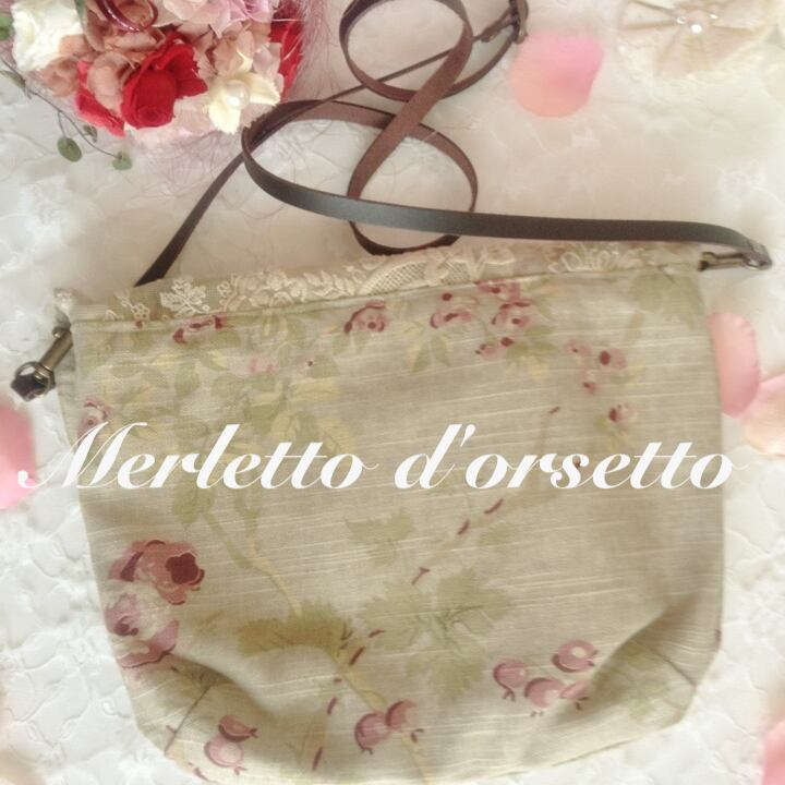 ヴィンテージレースをコラージュしてフラップ部分に使いました。オールドローズ柄のショルダーバッグです。ショルダーが取り外し可能になり、調整できます。