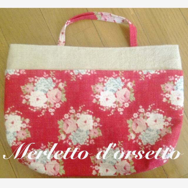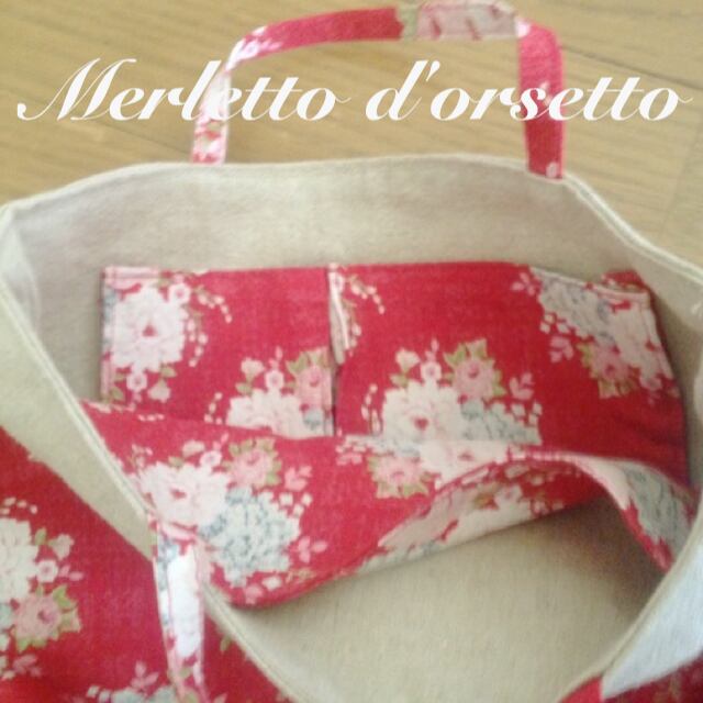 リネンと花柄のコンビのバッグインバッグです。花柄の部分がポケットになっています。中のポケットには携帯やカギが入ります。