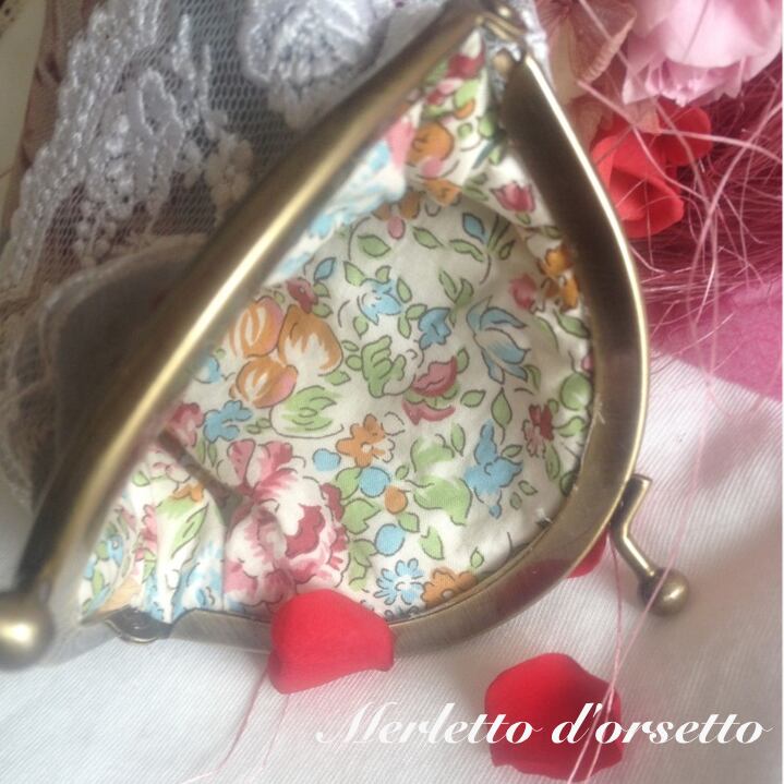 オールドローズプリント生地にレースをコラージュした可愛いプチがま口です。
