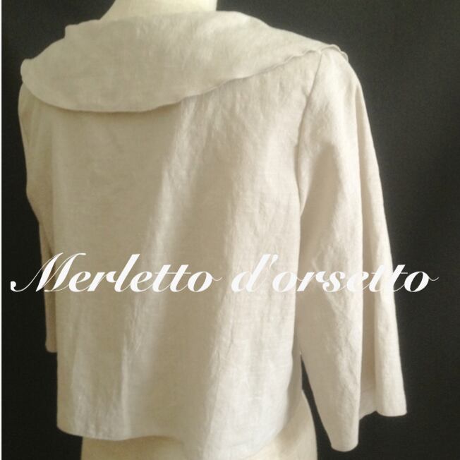 素材はコットンですが、ちょっと麻に似た感じです。ボタンはアンティークです。衿は二枚衿です。衿先にレースのコラージュがあしらってあります。