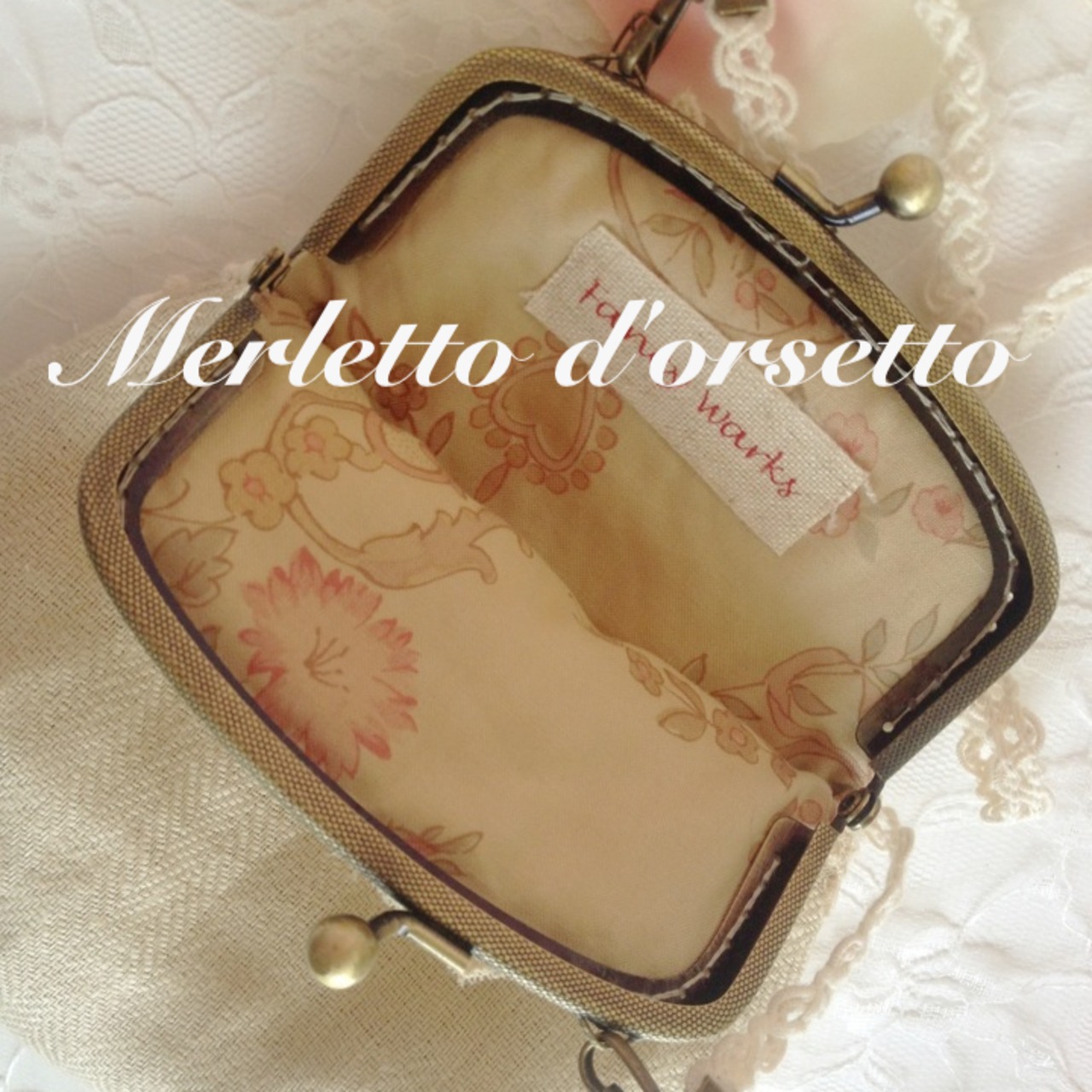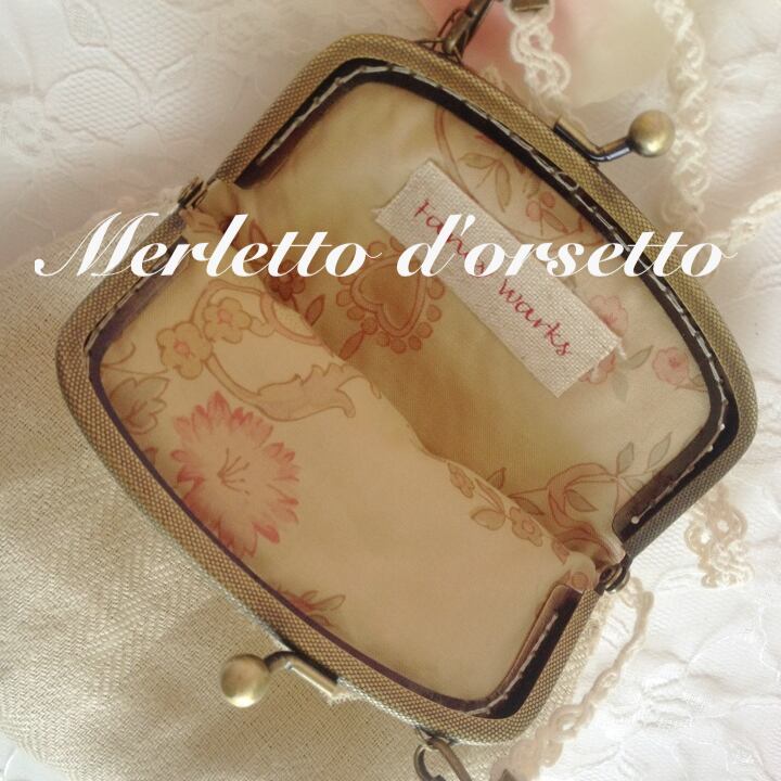 リネン生地にステキなレースのコラージュのがま口型ポーチです。ショルダー紐はレースで、取り外しが出来ます。ちょっとしたパーティーにもお持ちになれます。また、バッグの中に化粧品や小物を入れて忍ばせておくのもお洒落です。裏は小花柄のベビーピンクです。